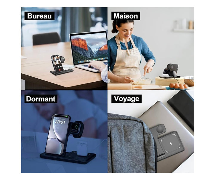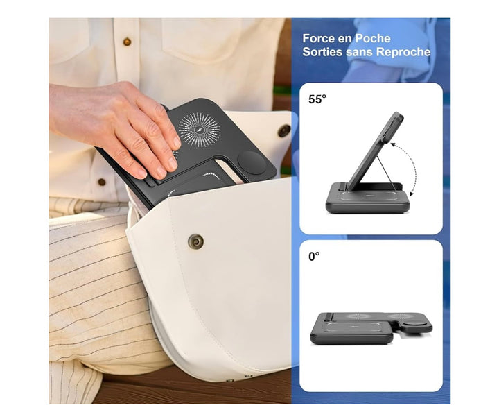 • 【Compact et pratique pour la portabilité】Notre chargeur sans fil 3-en-1, avec un design compact et pliable, combine style et utilité. Idéal pour les voyages, il se glisse dans vos bagages et permet de charger plusieurs appareils à la fois. Il sert également de support polyvalent pour votre téléphone avec un angle réglable. Que vous soyez en voyage, au bureau ou à la maison, il constitue une solution de recharge fiable et pratique pour tous vos appareils.
