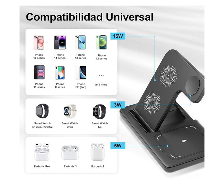 • 【Chargeur Induction Polyvalente 3 en 1】 Nos stations de recharge sans fil à la pointe de la technologie sont largement compatibles avec une variété d'appareils, y compris Phone 16/15/14/13/12/Pro/Max/Plus, la montre Ultra/8/7/6/6/5/4/3 et les Earbuds 3/2 Pro. Veuillez noter que nos produits ne sont pas compatibles avec d'autres montres.