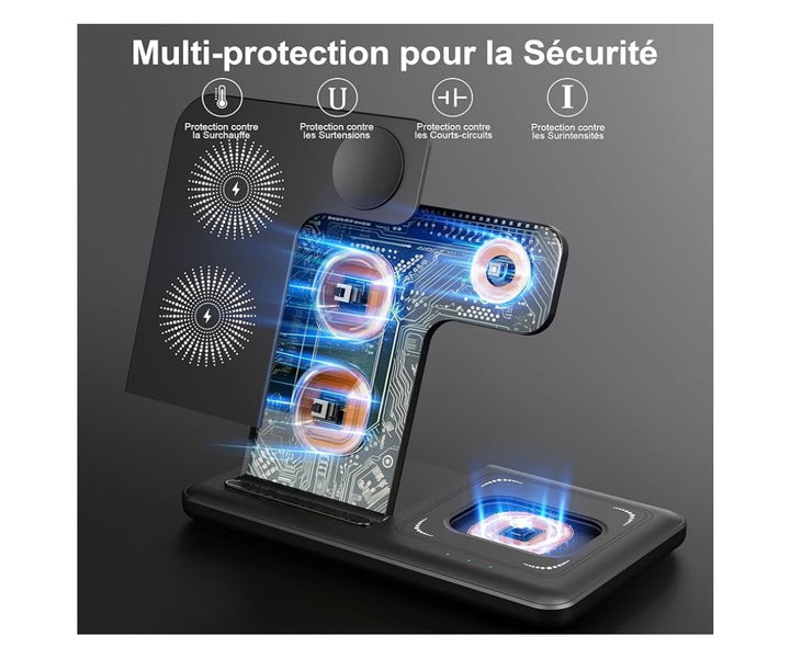 • 【Impeccable sécurité】 La station intègre un aimant de haute qualité qui assure un alignement précis et instantané pour une charge sans fil 3-en-1 rapide et fiable. Grâce à un chipset intelligent, la station offre une protection robuste contre les surintensités, les surtensions et les surchauffes, garantissant à vos appareils une charge sûre et régulière.