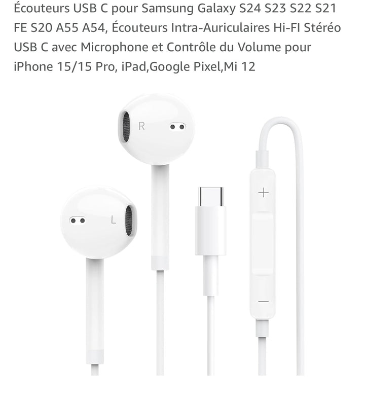 - Large compatibilité les écouteurs USB-C sont compatibles avec iPhone 15/15 Plus/15 Pro/15 Pro Max, pour Samsung Galaxy S24/S24 Plus/S24 Ultra/S23 FE/S23 Ultra/S23+Plus/S23/S22 Ultra/ S22 Plus S22+/S22/S21 FE/S21/S21+/S21 Ultra/S20 FE/S20/S20 Ultra/S20 Plus/Z Fold 5 4 3/Z Flip 5 4 3/A53/A54/A33/A34, iPad 10, iPad Air 4e génération/5e génération, iPad Pro 2022/2021/ 2020/2018 /iPad Mini 6e génération, Google Pixel 8 Pro/8/7 Pro/7/7A/6 Pro/6/5 et autres appareils USB C.