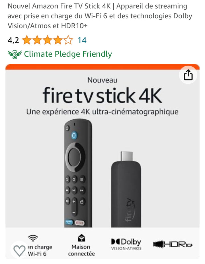 Notre stick lecteur en streaming le plus populaire prend désormais en charge le Wi-Fi 6 pour un streaming 4K fluide, avec moins d'interférences d'autres appareils connectés. Pour utiliser le Wi-Fi 6, vous devez disposer d'un routeur compatible tel qu'eero 6+. Si vous avez un routeur Wi-Fi 6E, nous vous recommandons d'opter pour Fire TV Stick 4K Max. Fire TV Stick 4K fonctionne également avec les routeurs plus anciens.