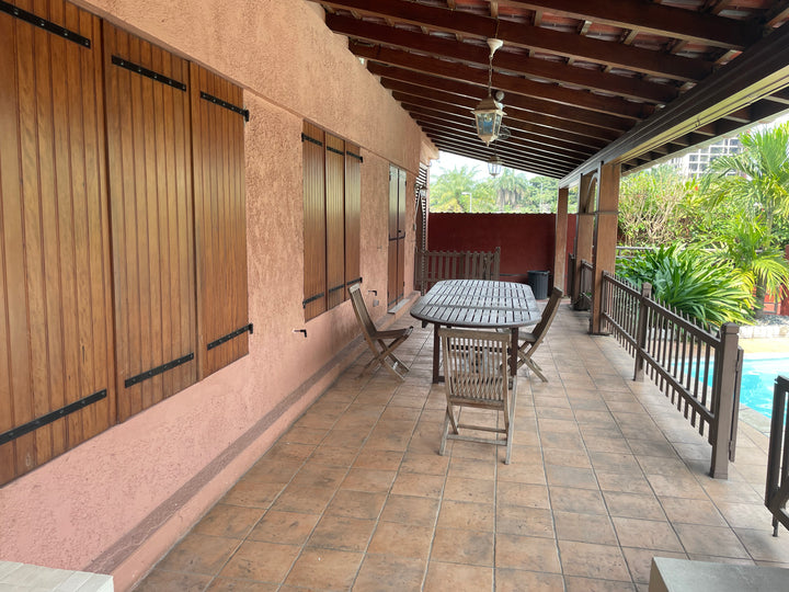 1 terrasse couverte en tuiles et poteaux en bois dur (Izombé) équipée de luminaires et de ventilateurs
