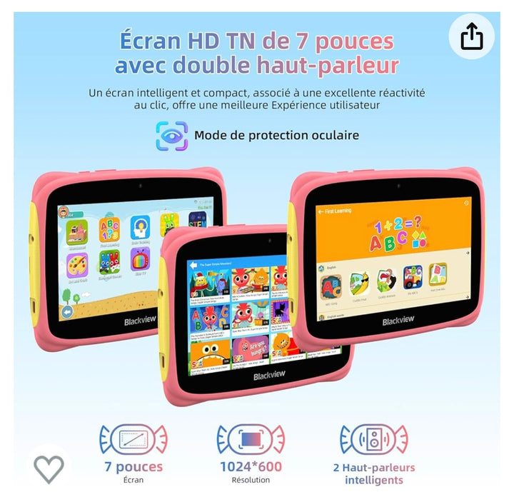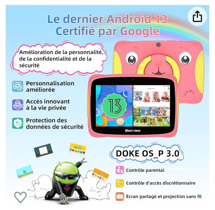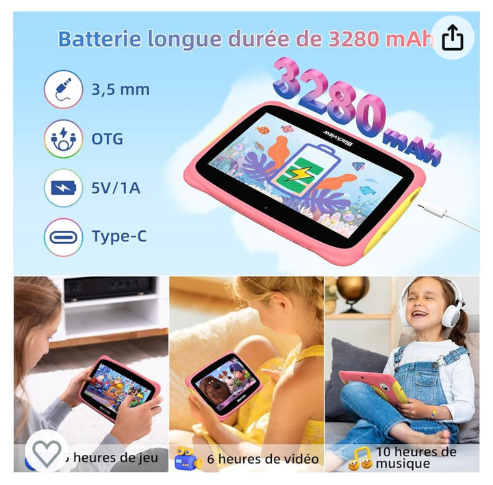 Tablette Enfants 7" Android 13 + Protection antichocs Rose -20.000F