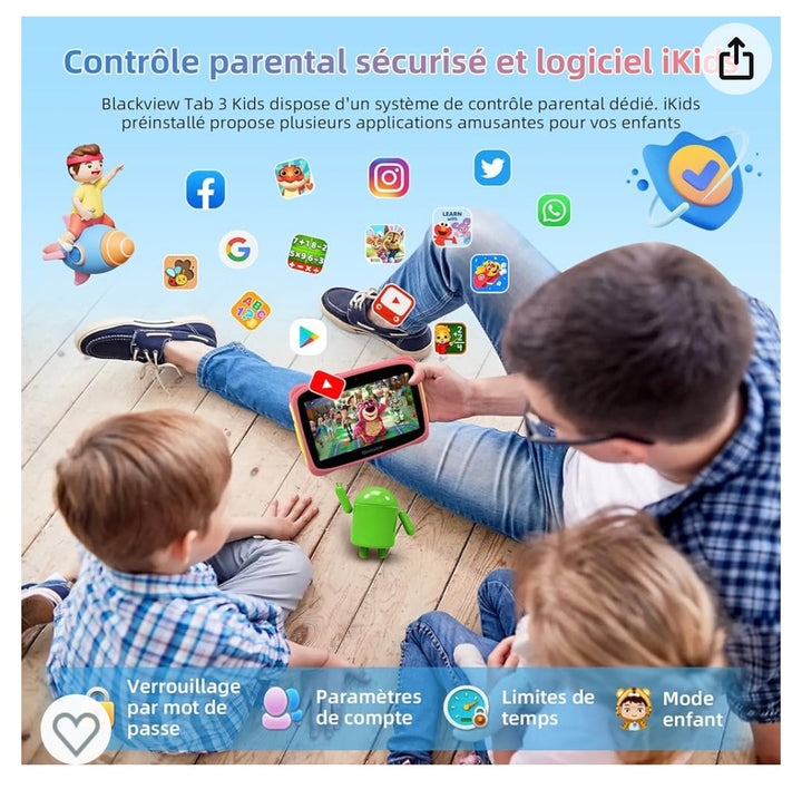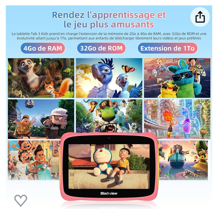• 🍓【𝐒𝐲𝐬𝐭è𝐦𝐞 𝐀𝐧𝐝𝐫𝐨𝐢𝐝 𝟏𝟑 & 𝟒𝐆𝐨 + 𝟑𝟐𝐆𝐨, 𝟏𝐓𝐨 Extensible】🍓Blackview Tab 3 Kids Tablet PC est équipé d'un processeur quad-core et dernier système d'exploitation Android 13 ,garantissant une expérience de jeu ultra fluide et des opérations multimédia rapides. 4Go de RAM + 32Go de ROM capacité de stockage ce qui est suffisant pour gérer les Petites tâches quotidiennes, et prend en charge l'extension jusqu'à 1To pour stocker les gros jeux, les titres audio et vidéo, etc. Blackview Tab 3 Kids vous permet d'ouvrir plus d'applications en même temps et de passer d'une application à l'autre d'une manière ultra fluide, que vous travailliez ou appreniez avec votre tablette.