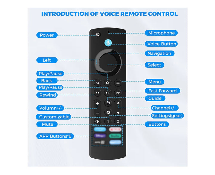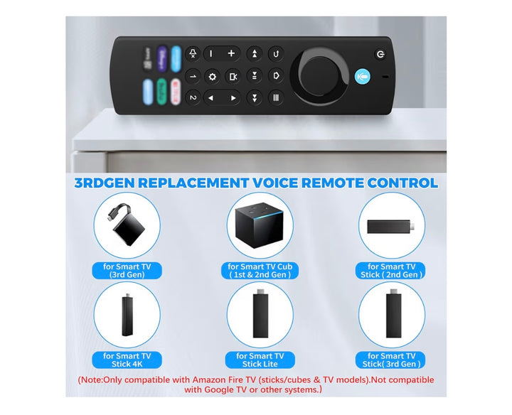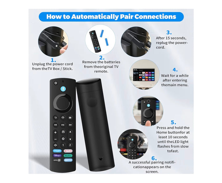 • Contenu de la Livraison:1* Télécommande vocale + 1* Mode d'emploi (2 piles AAA non incluses) ⚠ Remarque : 1 : Veuillez vous assurer que les piles de l'ancienne télécommande ont été retirées avant l'appairage, si l'ancienne télécommande est encore en état d'appairage, la nouvelle télécommande ne peut pas être utilisée ; 2:Si plus de 6 appareils sont connectés, veuillez confirmer votre télécommande.(Remarque : ne prend en charge que les systèmes Amazon Fire TV (par exemple Fire TV Stick/Cube et téléviseurs partenaires), n'est pas compatible pour Google TV ou d'autres systèmes).